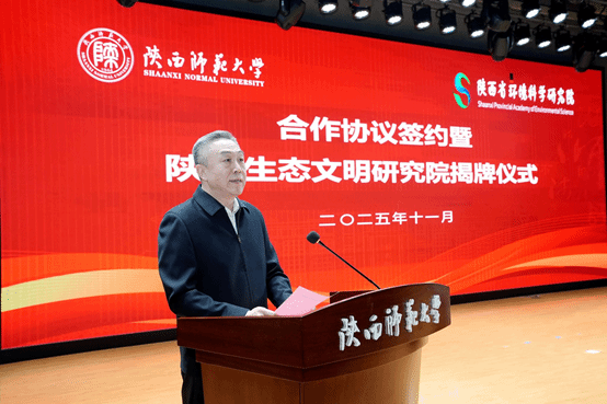 与陕西省环境科学研究院签署合作协议,并举行陕西生态文明研究院揭牌仪式。中国工程院院士冯起,陕西省生态环境厅纪检监察组组长刘志生,陕西省环境科学研究院院长魏新军,校党委书记李晓兵,校长游旭群,副校长董治宝、陈新兵,校长助理袁一芳出席大会。会议由董治宝主持。