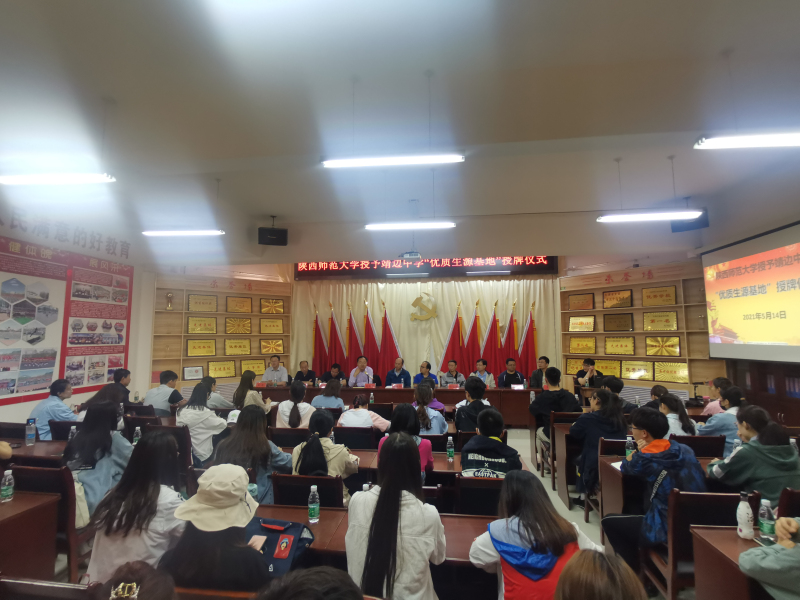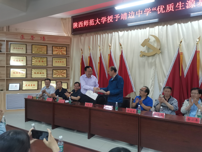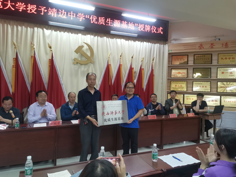 靖边中学校长刘致中、副校长李万军、副校长刘元艺、王泉等领导热情接待了各位老师并举行了授牌仪式。段克勤副院长代表学校与靖边中学签约共建“优质生源基地”, 党委副书记郝高建与副校长李万军为优秀生源基地揭牌。签约授牌仪式结束后,中学领导、地理教研组全体教师与伊莉讨论区