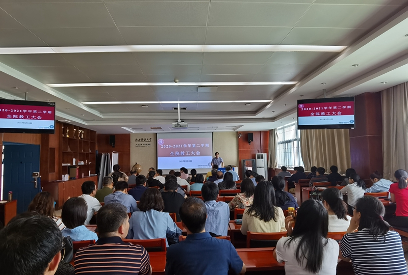 5月12日下午学院在格物楼一层报告厅召开全院教工大会,学院党政领导班子、全体教职工参加。会议由院长周正朝主持。