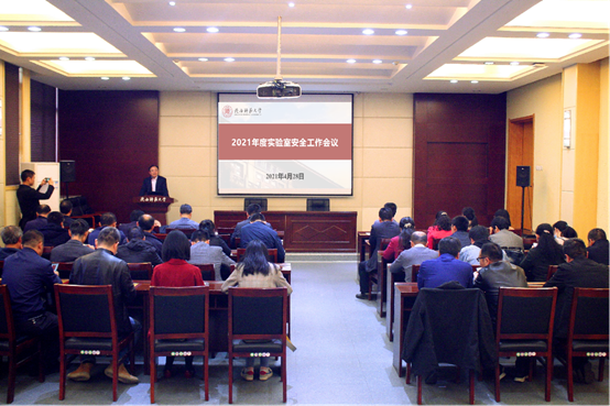 2021年度实验室安全工作会议在长安校区文汇楼A区一层报告厅召开。会议由实验室建设与管理处处长李保新主持。学院党委书记王明道、副院长李君轶、学校实验室安全督导贠蒲军、学院实验中心主任李敏睿、实验中心老师贠疆参加了会议。