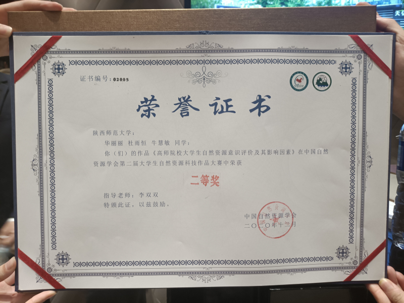 李双双老师指导,华丽丽、杜雨恒、牛慧敏同学的参赛作品《高师院校大学生自然资源意识评价及其影响因素》荣获二等奖,由王浩老师指导,孙泽兴、李汶怡、刘嘉敏、曹淑慧同学的参赛作品《陕西省生态恢复综合效益评估》荣获优秀奖。李双双老师被评为优秀指导教师,伊莉讨论区