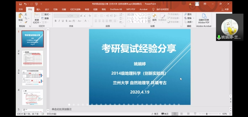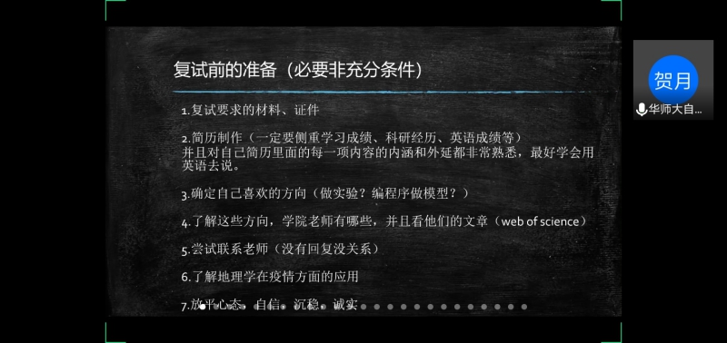 、2013级地理信息科学吴苏杰(就读于中山大学)、2014级地理科学创新班贺月(就读于华东师范大学)、2014级地理科学创新班姚娟婷(就读于兰州大学)、2015级地理科学创新班宣晓静(就读于北京师范大学)四位优秀校友在线分享。学院党委副书记郝高建、团委书记王蓓蓓及学院考研、复试的90余名同学参加了交流会。会议由党委副书记郝高建主持。