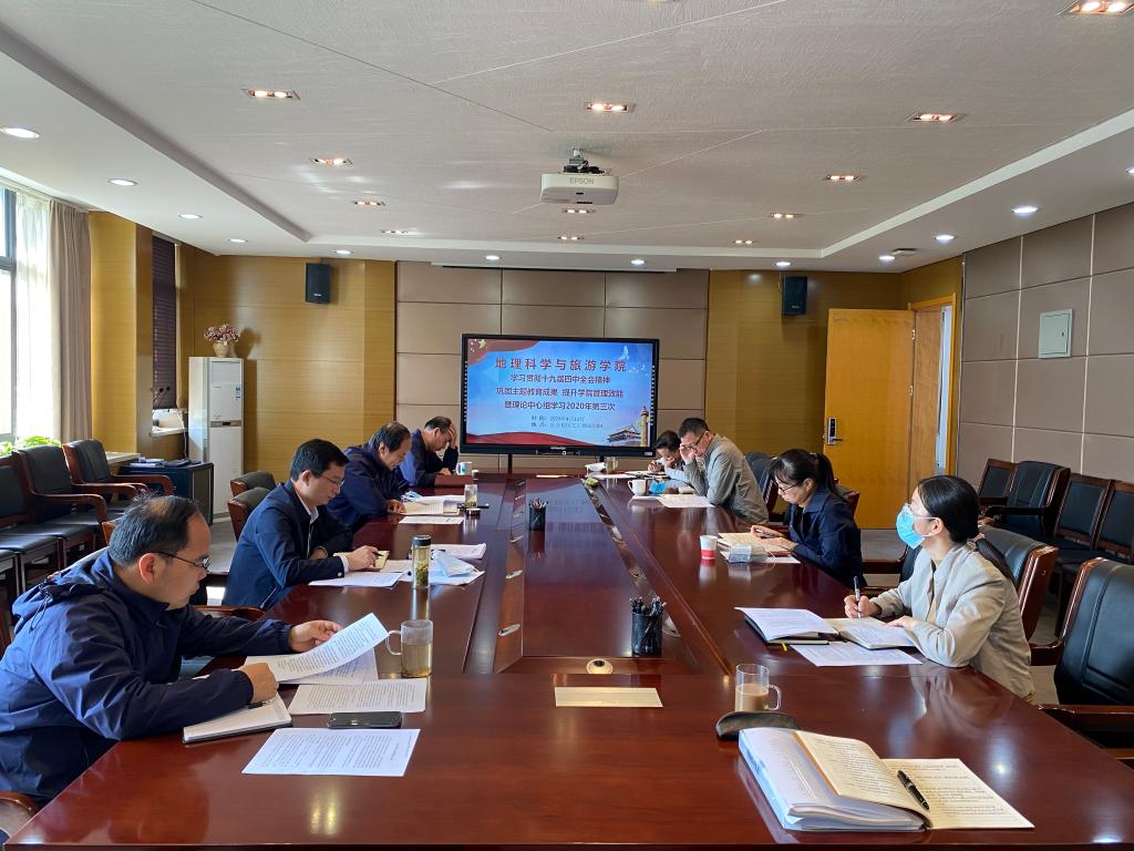在文汇楼B段会议室召开学习十九届四中全会精神暨党委理论中心组学习研讨会,围绕《巩固主题教育成果,提升学院管理效能》开展学习研讨,并就当前疫情防控工作和学校、学院重点工作开展交流,学院党委委员、班子全体成员参加会议。
