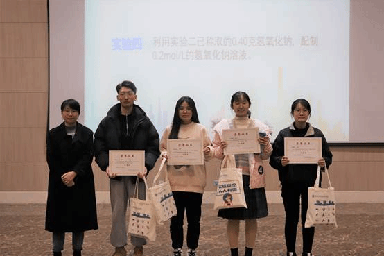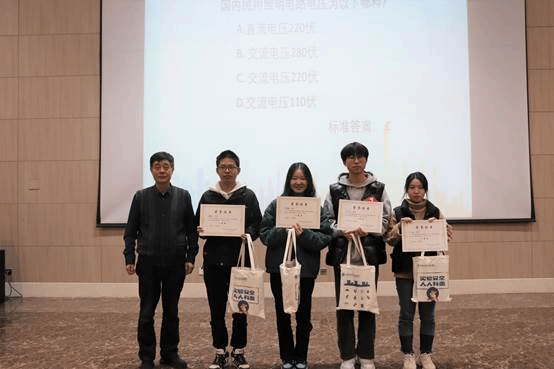 全部本科生和研究生共同参加,同学们先在题库学习后进行了闭卷答题(初赛),各级辅导员阅卷后筛选出本年级4个优胜者,再混合组成四个代表队进行决赛。11月17日晚7点,决赛在热烈的氛围中拉开序幕,学院副院长段克勤老师首先为比赛致辞,他强调“无论是从实验室的使用功能,还是从实验室的自身发展来看,我们都应该强调把实验室的安全防范作为实验室管理的基础”,并郑重宣布本届实验安全知识竞赛决赛正式开始。随后四个代表队分别通过必答题、抢答题环节、隐患查找和实验操作环节决出一等奖1组、二等奖1组、三等奖2组。比赛结束之后,评委老师们分别为同学们进行颁奖,并进行合影留念。