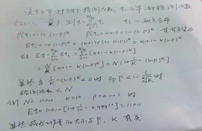 其次,刘新平教授从学科知识出发,深入浅出为同学们讲解当前疫情形势下,数理统计的实际案例。指出在当前时期,核酸检测成热议话题,其检测方法有两种:1,逐个检查,2,将受检者分组,每k个人一组,将k个人混检,若为阴性,则k人只需做一次检测;若为阳性,则对这k人再逐个检测,这样对k人需进行k+1次检测,设每个人检测结果为阳性的概率为p,且各人检测结果相互独立,现在要问第二种方法能否减少检测次数?回答是肯定的,利用概率论中两点分布和数学期望的性质:若受检人数10000,k=10,p=0.001时,则检测次数的期望值可以算出为1100。刘新平教授将简单的数学模型用于疫情防控,可见数学在日常生活中的应用是如此之广,将数据分析与国家发展战略紧密联系,充分体现了数学强大的应用性。(下图为讲座后刘老师与同学们交流的手稿)