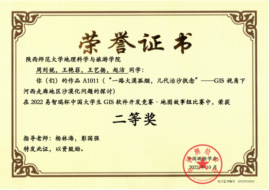 周刘妮、王艳菲、王艺扬、赵洁提交作品《“一路大漠孤烟,几代治沙执念”——GIS视角下河西走廊地区沙漠化问题的探讨》,荣获地图故事组二等奖;