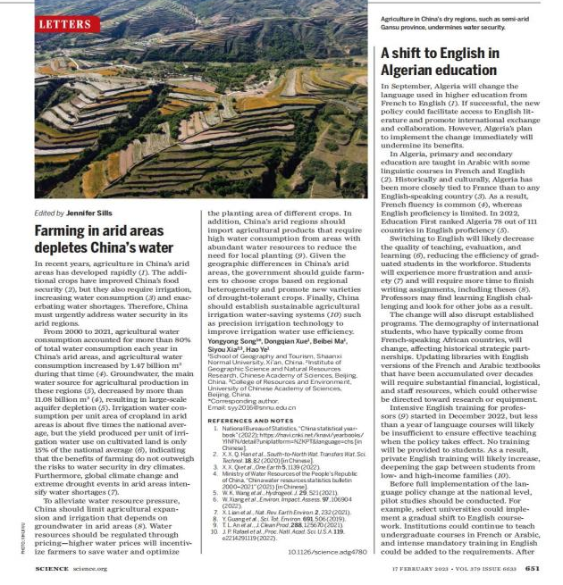 论文引用格式:Song, Y., Xue, D., Ma, B., Xia, S., & Ye, H. (2023). Farming in arid areas depletes China’s water.Science, 379(6633): 651.