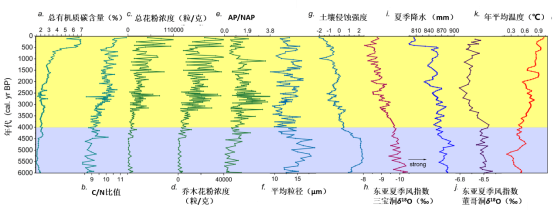 该研究基于跑马梁(海拔3556 m)连续沉积序列,使用孢粉、有机碳等指标重建植被生产力的变化,使用粒度和矿物磁性等参数表征土壤侵蚀强度的变化。高分辨率湖沼记录显示,在5850~4000 cal. a BP期间,当年平均温度低且夏季降水丰沛时,植被生产力低,土壤侵蚀较为严重。自4000 cal. a BP开始,随着年平均温度的升高和夏季降水的减少,植被生产力显著升高,而土壤侵蚀则减缓(图1)。其中,植被生产力的变化(导致植被密集或稀疏)也会间接影响到土壤侵蚀强度的变化。