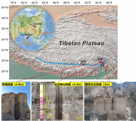 青藏高原,被称为“世界屋脊” 和地球的“第三极”,以干旱和半干旱为主要气候特征,生态环境脆弱,对全球气候变化的响应极为敏感。同时,作为亚洲季风的“发动机”,青藏高原也能够影响全球的气候变化。在夏季,由于青藏高原接收较多的太阳辐射,热低压加深,吸引来自孟加拉湾的暖湿气流即南亚夏季风沿着雅鲁藏布江(简称雅江)河谷进入到青藏高原南部,给当地带来丰富的降水;在冬季,高原降温比较快,冷高压增强,使高原上的冷干空气不断向海洋输送,形成南亚冬季风。雅江位于青藏高原南部,河谷内部地势西高东低,这使得南亚冬季风主要沿着雅江河谷的方向自西向东流动。雅江流域植被稀疏,加上冬春季节雅江河流水位的显著下降,大量松散沉积物裸露,在南亚冬季风的驱动下,沙尘暴频发。黄土是沙尘暴过程中沉积并遭受不同程度成壤作用的风成沉积物。因此,雅江黄土成为了研究南亚夏季风和冬季风变化的重要载体。对于南亚夏季风的认识,以往多是基于石笋、湖泊和海洋沉积物的研究,并且这些载体记录的南亚夏季风的变幅和变率存在显著的差异。此外,相对南亚夏季风,南亚冬季风的研究极为薄弱。鉴于此,团队选择了雅江流域3个时间段(末次间冰期、早全新世和晚全新世)的黄土剖面(图1)进行研究,通过光释光和AMS14C建立剖面的年代序列,将频率磁化率、色度和研究团队新近提出的粒度分选系数分别用于南亚夏季风和冬季风的重建,以探讨南亚季风的驱动机制,主要得到以下研究进展。
