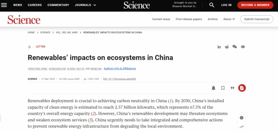 Song Yongyong, Xue Dongqian, Wen Qi, Ye Hao, Ma Beibei. Renewables’ impacts on ecosystems in China[J]. Science, 2024, 383(6689): 1302-1303.